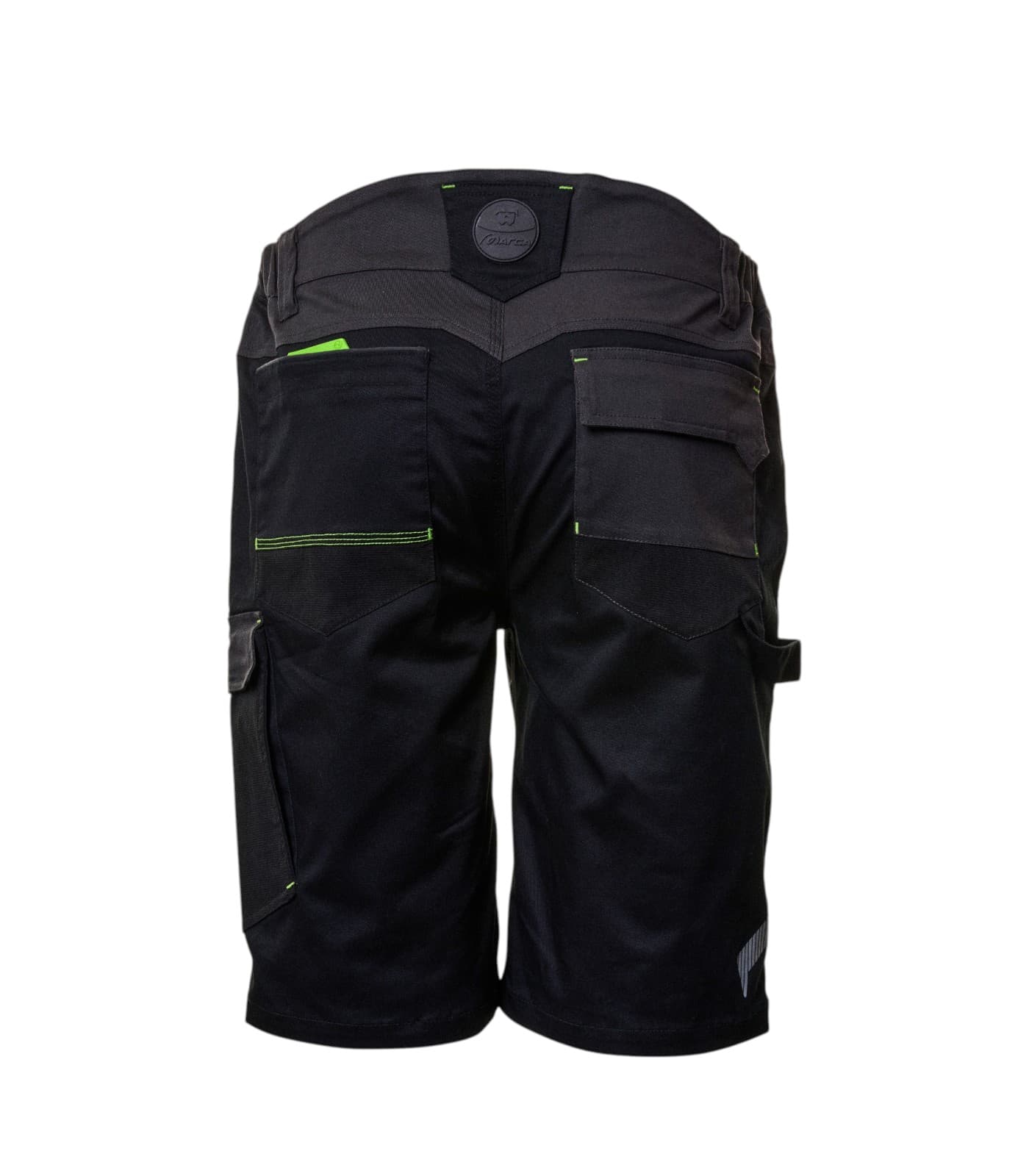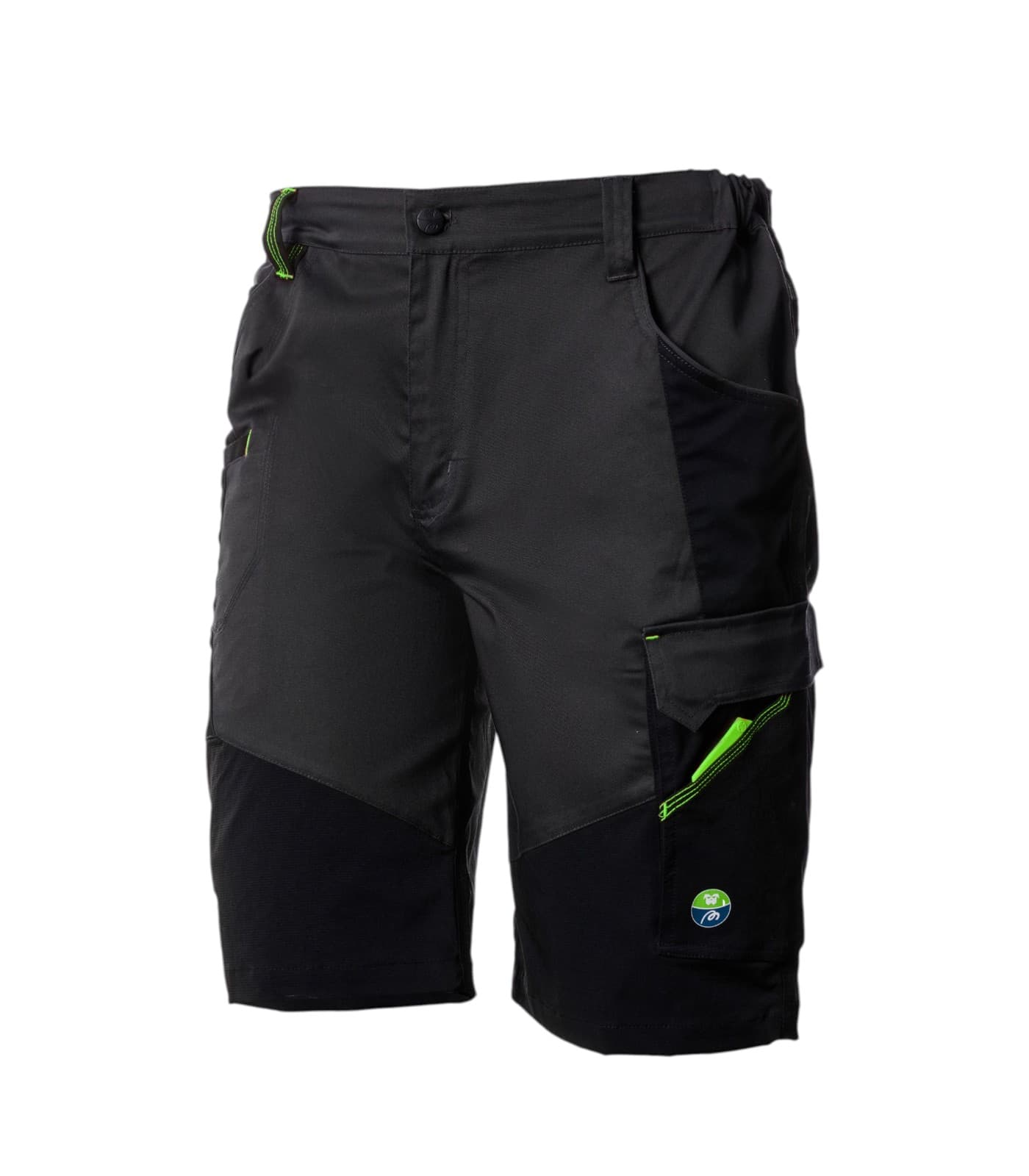 Bermuda da lavoro multitasche bicolore in tessuto stretch 60% cotone, 37% poliestere, 3% elastan (245 g/m²) con inserti 4way stretch 86% nylon, 14% elastan (245 g/m²) e dettagli a contrasto. 2 tasche vita con piping reflective e portamonete, tasca cargo con patta e simil velcro + tasca obliqua, portametro e porta cellulare, 2 posteriori. Elastici fianchi, dettagli reflective, chiusura zip YKK e bottone. Ideale per divisa aziendale personalizzata tramite stampa o ricamo del logo.