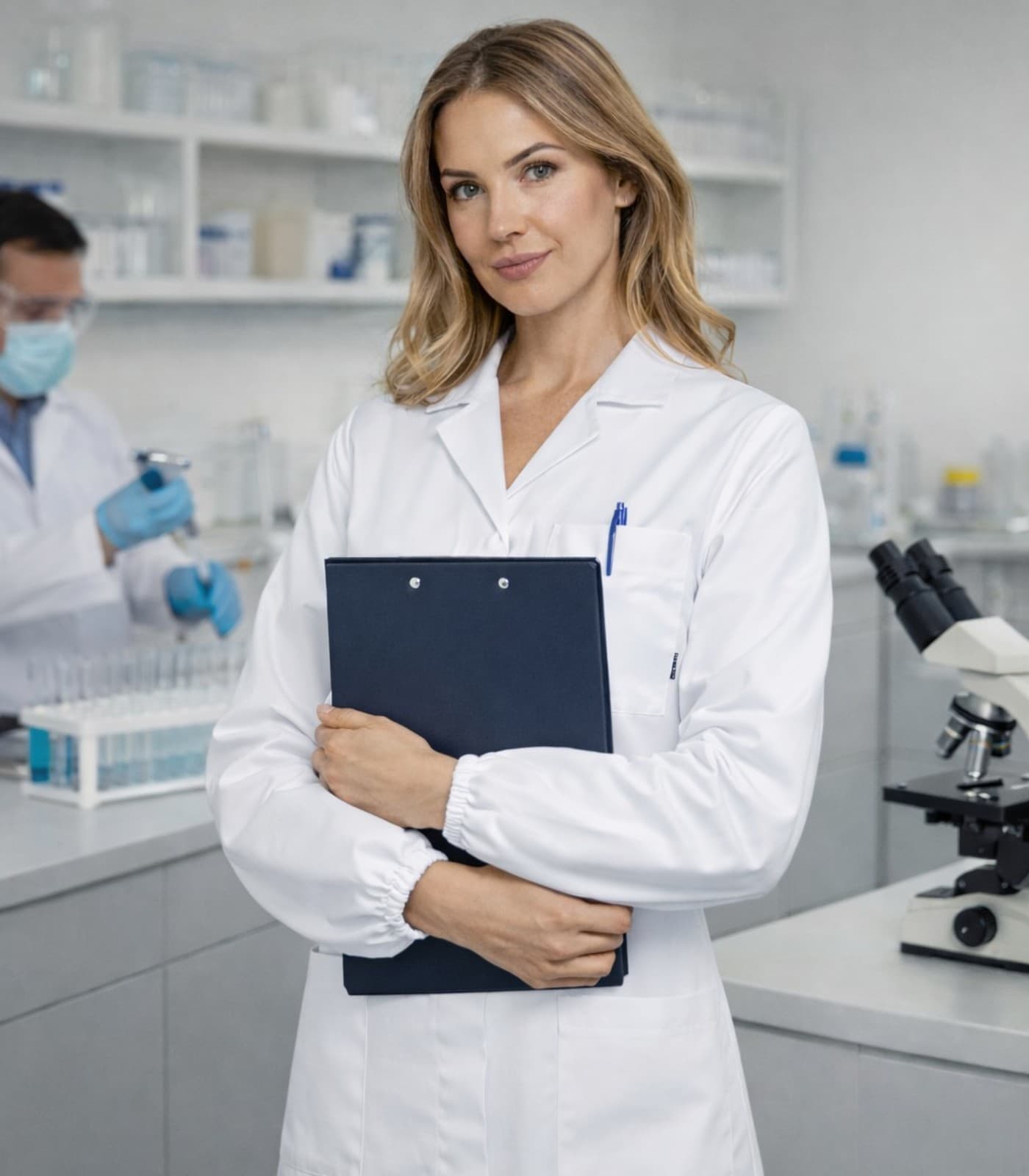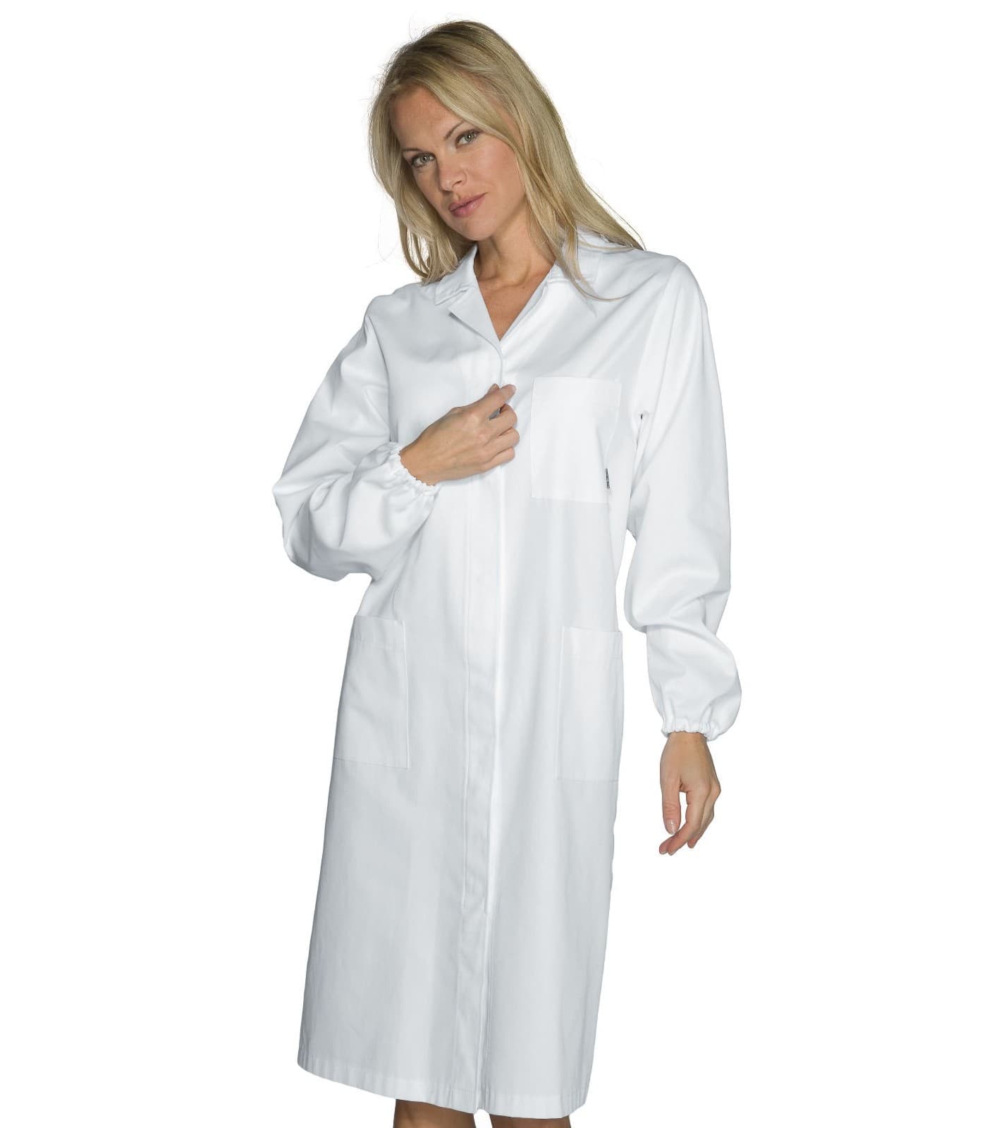 Camice da lavoro da donna a manica lunga in tessuto misto poliestere/cotone, leggero e resistente, ideale per settore medicale, sanitario, estetico e alimentare. Tessuto traspirante da 150 g/m² per comfort durante l’uso prolungato. Vestibilità funzionale e pratica, adatta a diverse professioni operative.