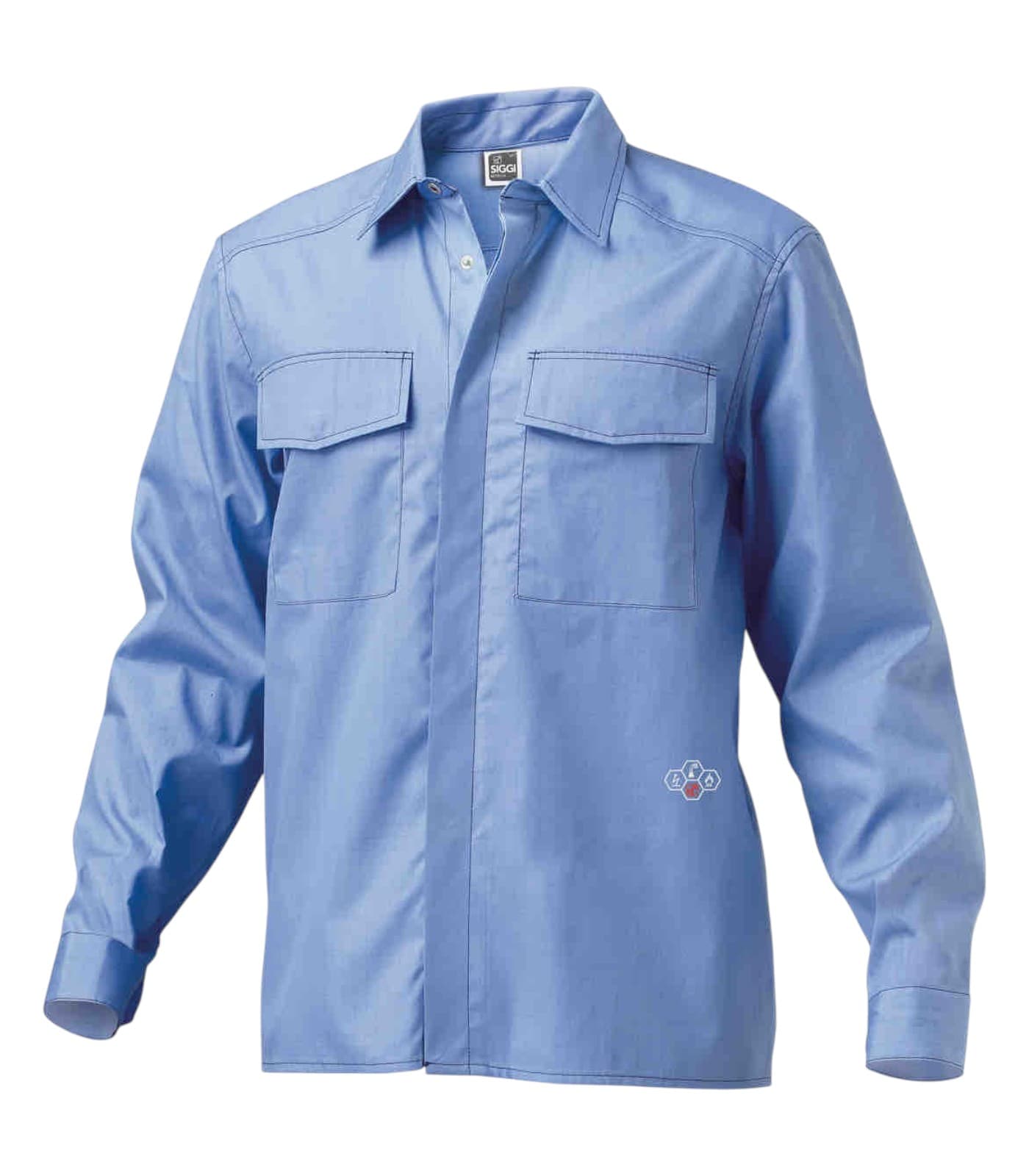 Camicia da lavoro multiprotezione in cotone, poliestere e fibra antistatica, ideale per ambienti industriali e ATEX. Tessuto da 185 g/m² che unisce comfort, resistenza e protezione durante l’uso quotidiano. Abbottonatura nascosta e polsi con bottoni a pressione, con taschini frontali chiusi per maggiore praticità. Proprietà antifiamma e antistatiche certificate secondo normative: