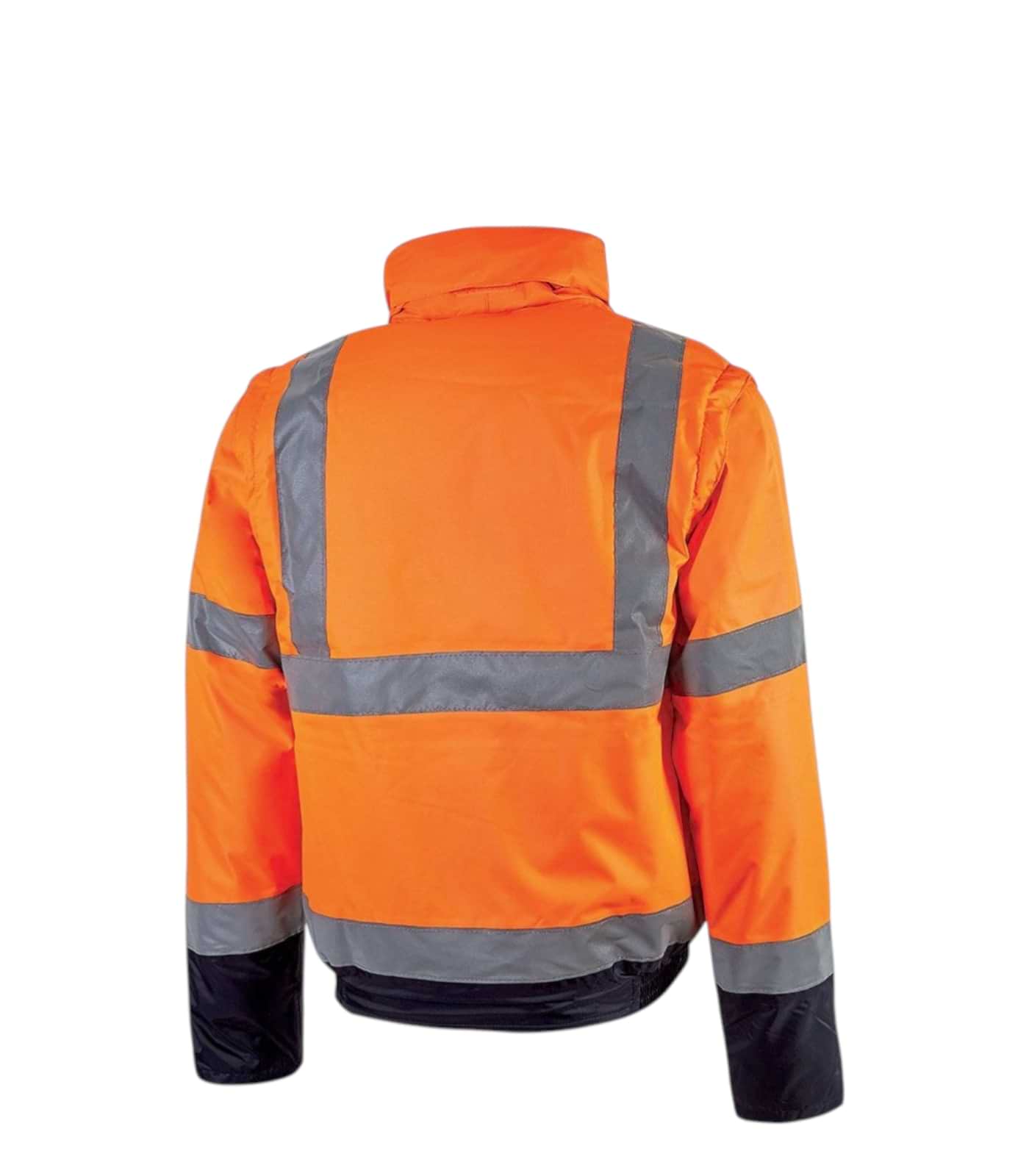 Giubbotto bomber alta visibilità invernale con maniche staccabili, impermeabile e traspirante. Dotato di bande riflettenti, tasche multifunzione e cappuccio a scomparsa. Protezione certificata per il lavoro outdoor.