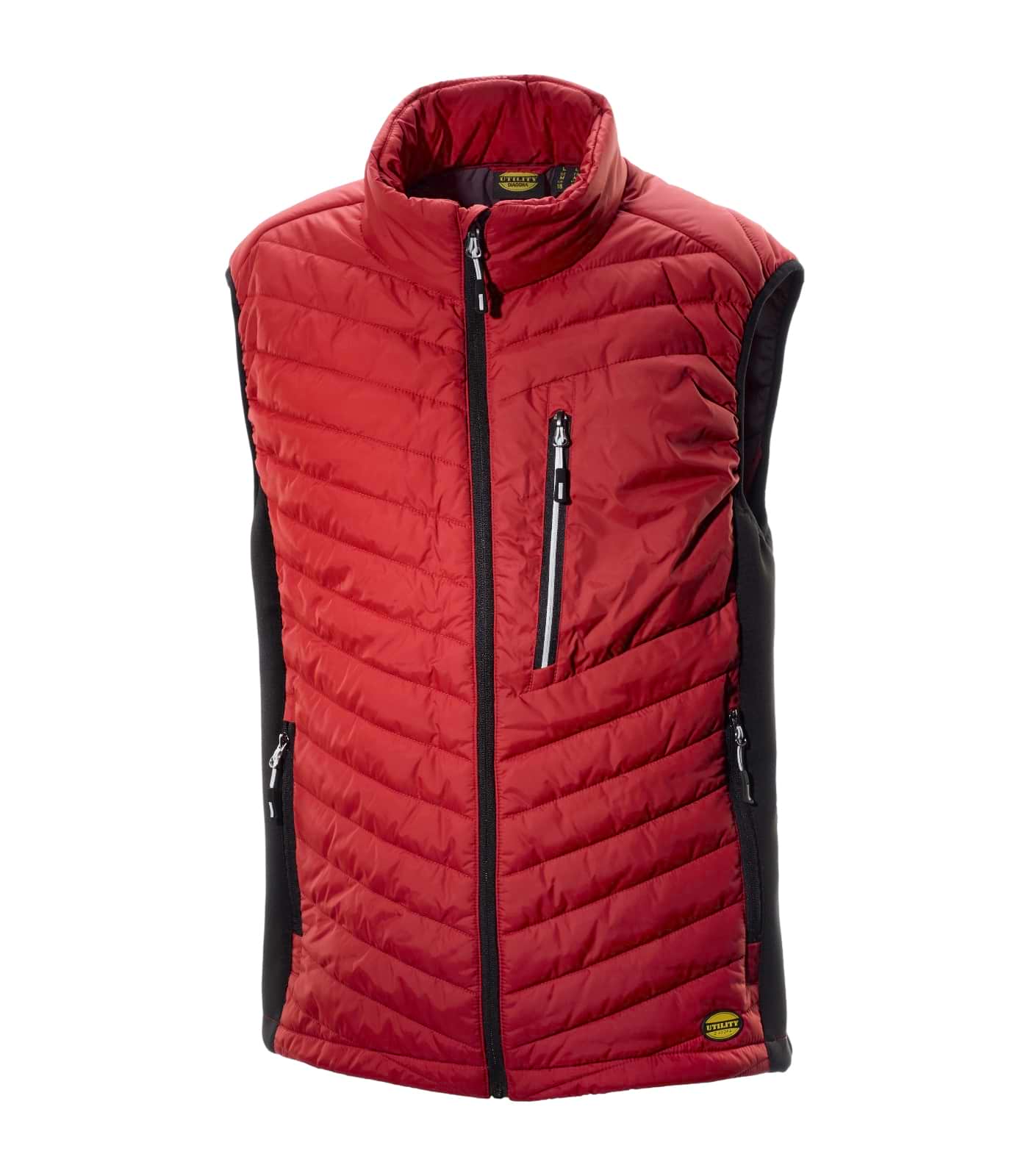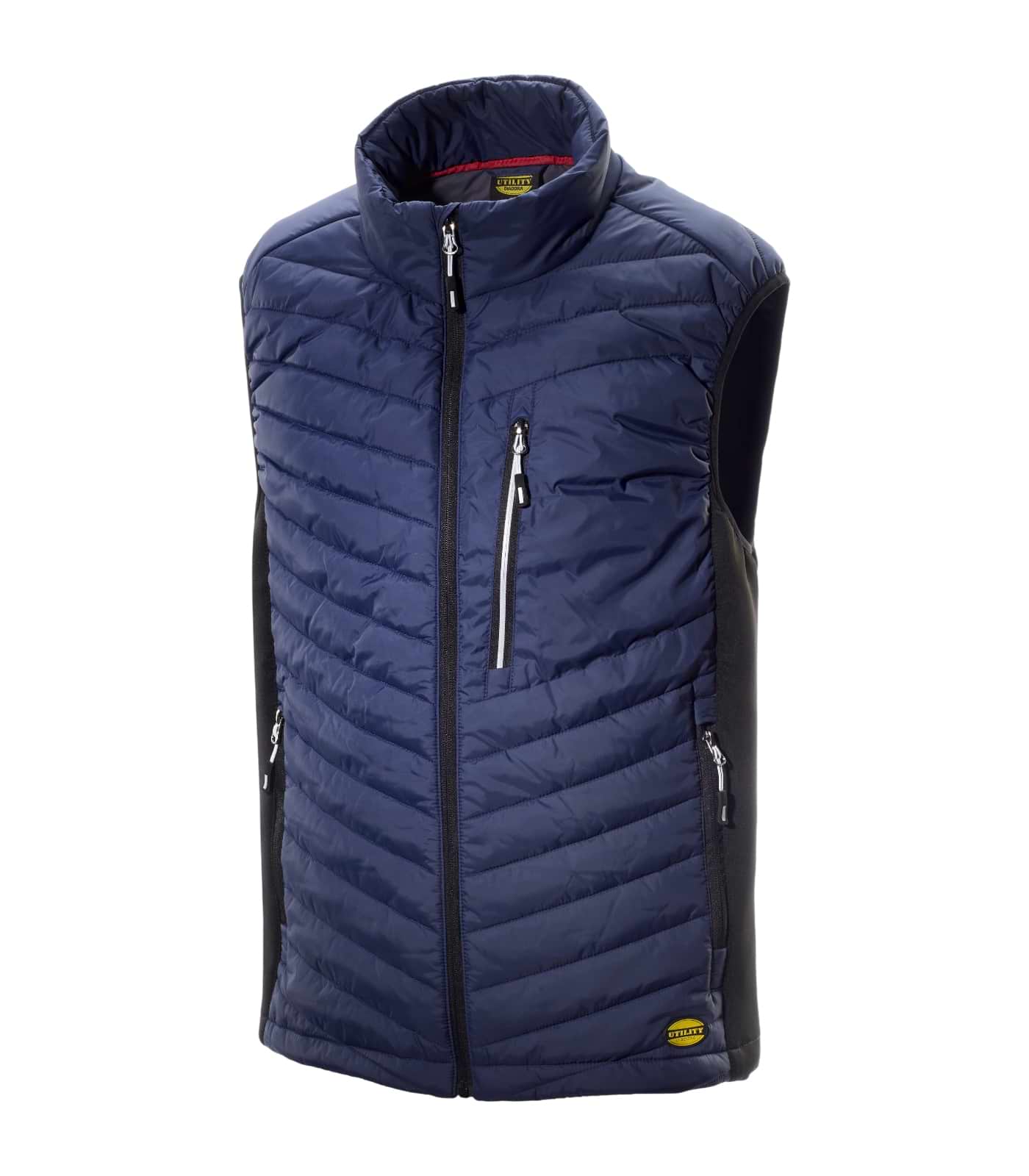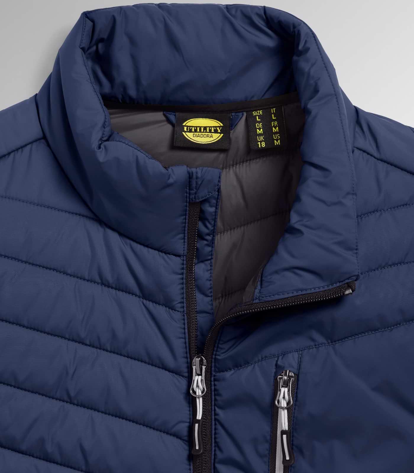 Gilet da lavoro imbottito leggero di Diadora Utility. Fit comfort, inserti stretch e schiena lunga. Tasche zip e dettagli reflex.