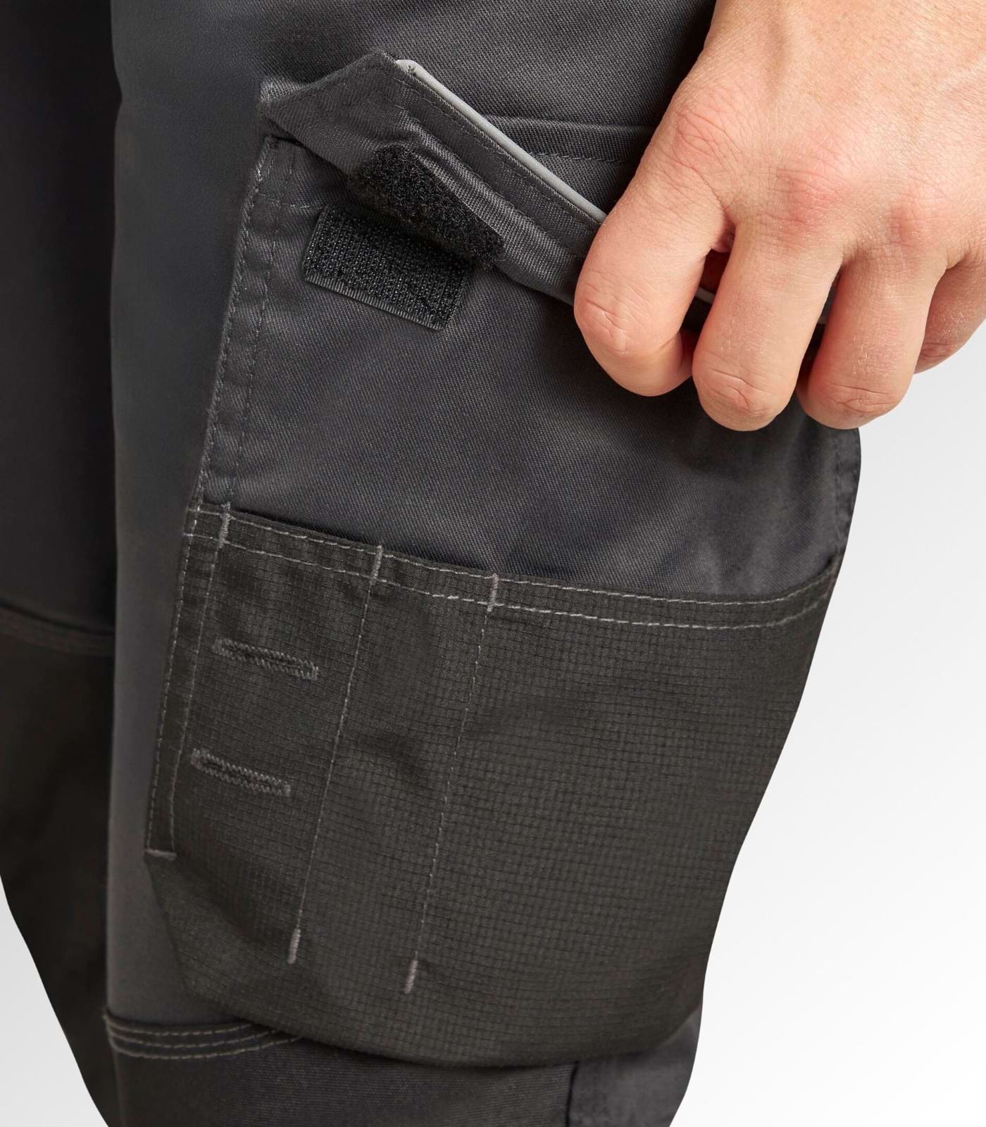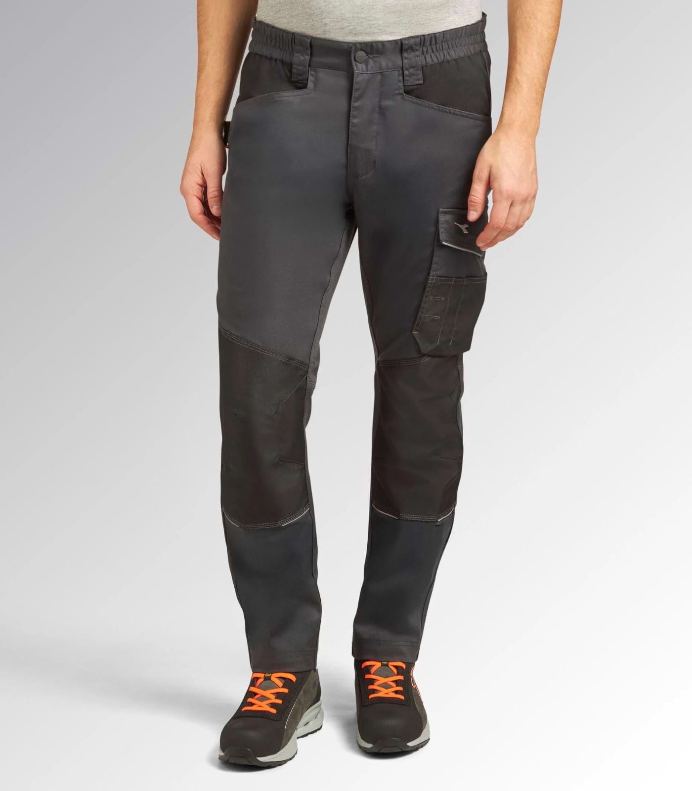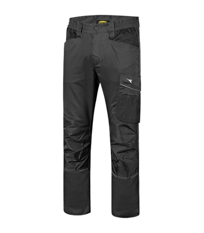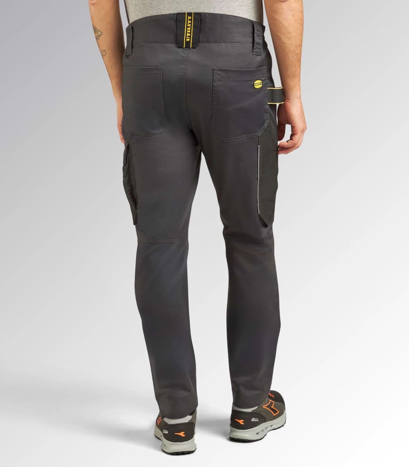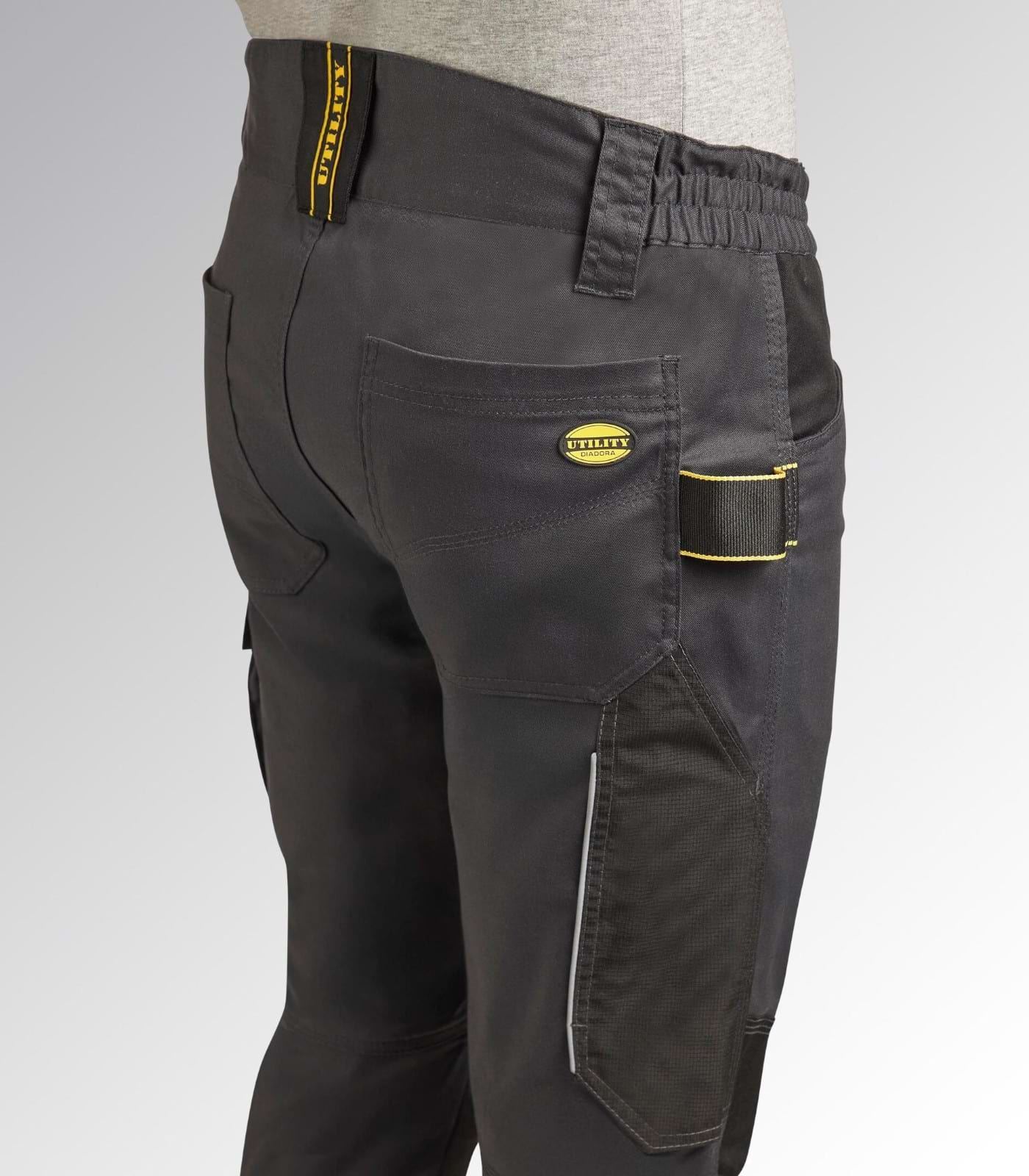 Pantalone in poli-cotton stretch, tasca laterale multifunzione rinforzata con materiale ripstop, tasca portametro in ripstop, portamartello, due tasche aperte frontali e due sul retro. Tasche porta ginocchiere rinforzate in Oxford, chiuse sul fondo con velcro. Elastico in vita, cintura sagomata, passante centrale con personalizzazione Utility, bottone antigraffio, dettagli reflex, slim fit, gamba ergonomica, tripla cucitura.