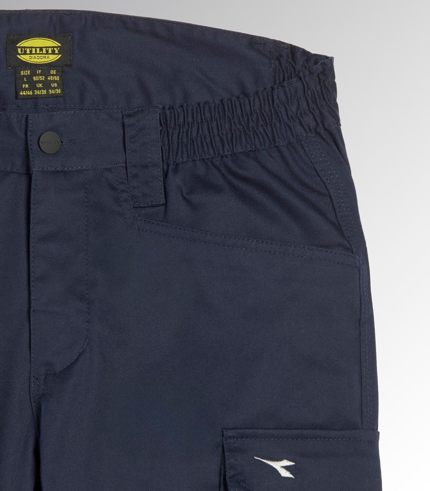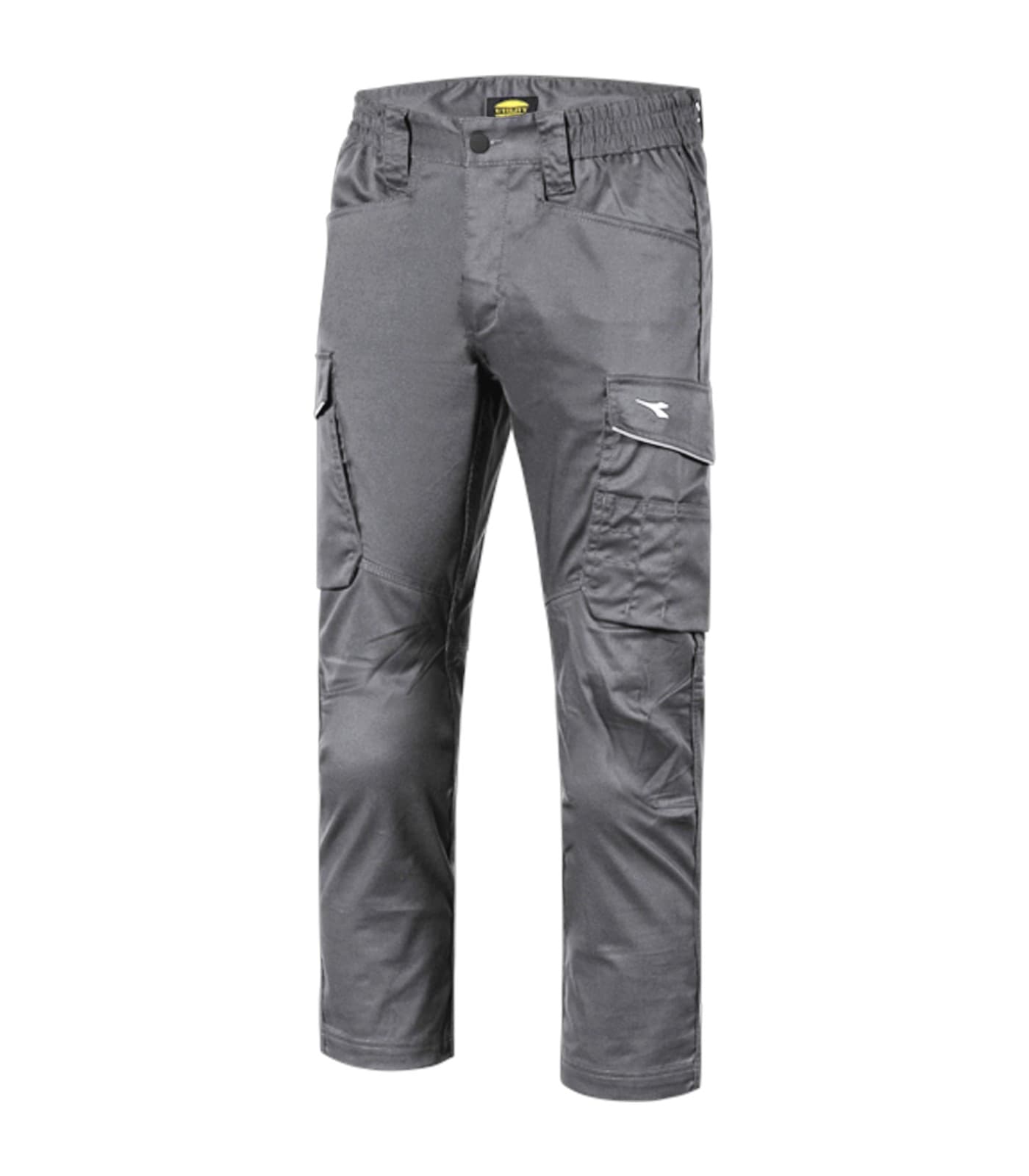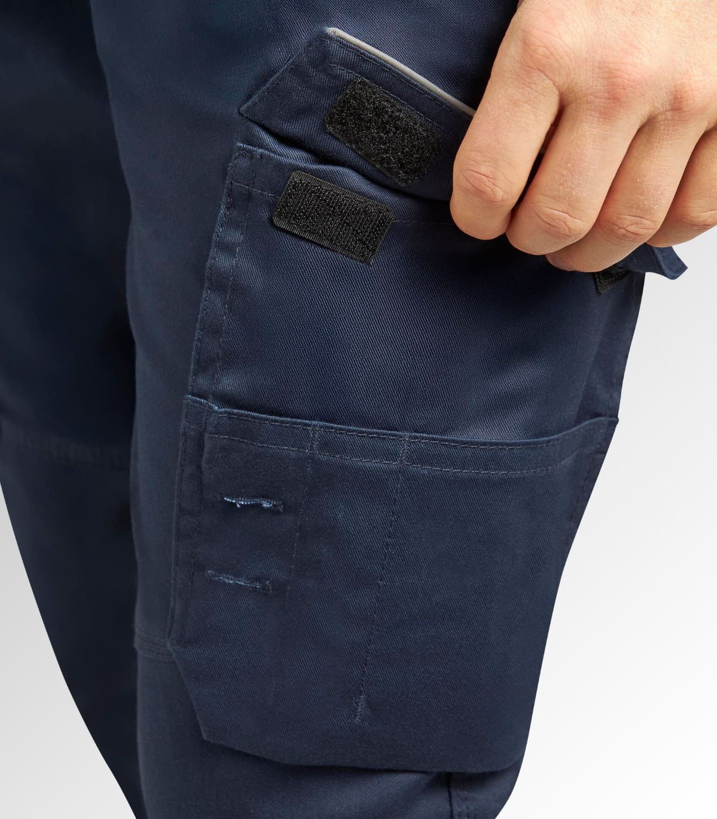 Pantaloni da lavoro in poli-cotton stretch, due tasche cargo laterali con chiusura in velcro di cui una multifunzione, due tasche aperte frontali e due sul retro, dettagli reflex, elastico in vita. Cintura sagomata, passante con personalizzazione Utility, slim fit, gamba ergonomica con pence sulle ginocchia, bottone antigraffio, tripla cucitura.