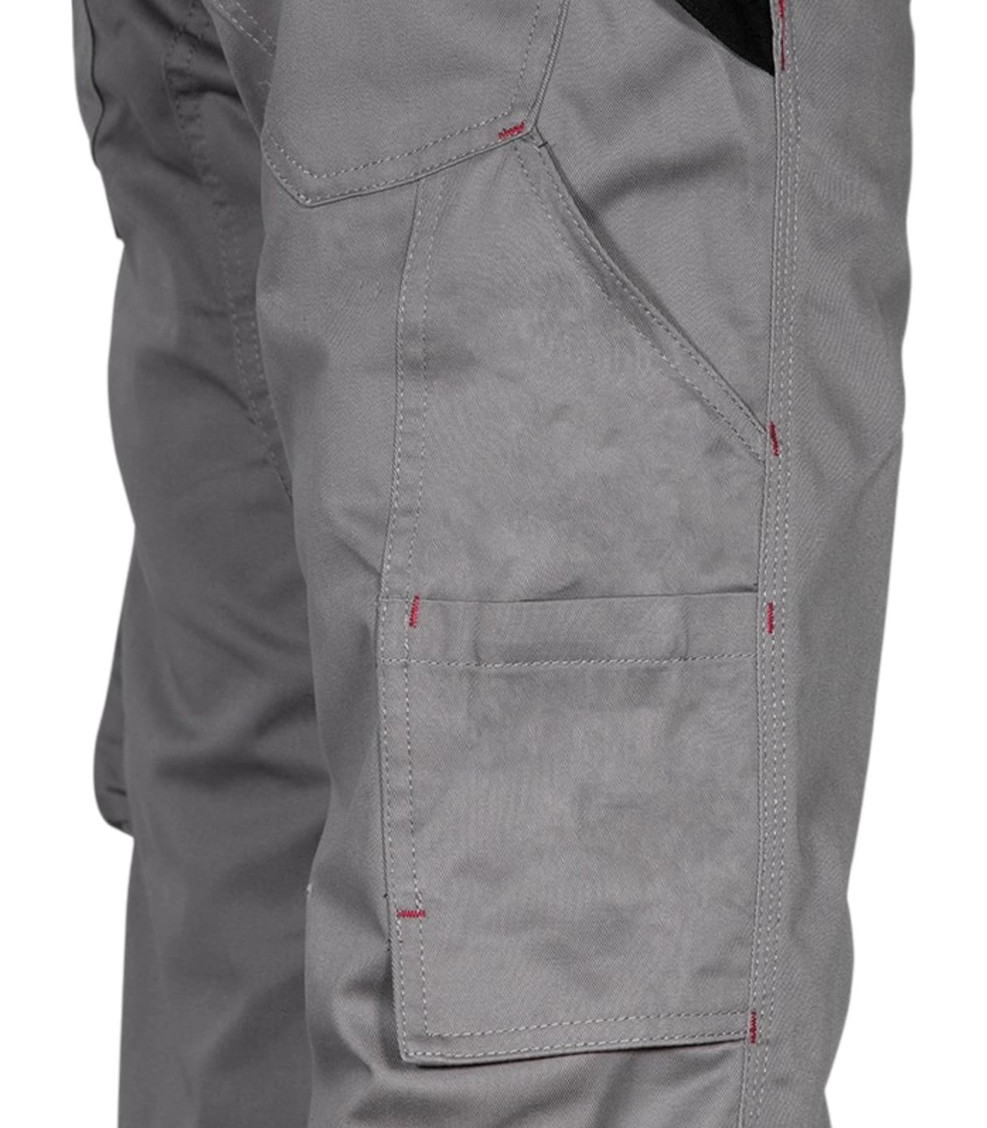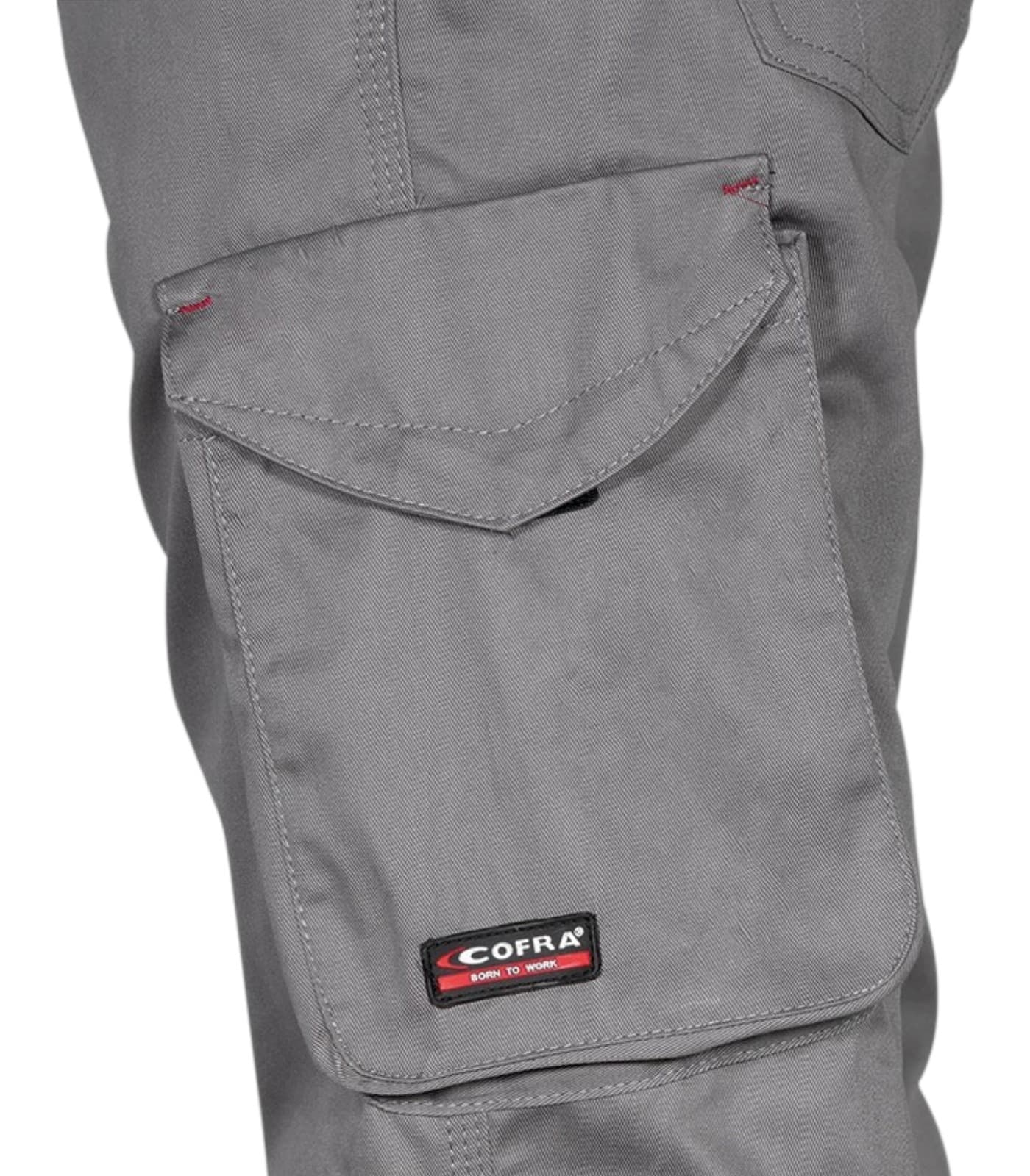 Pantalone da lavoro multitasche in cotone/poliestere, resistente e versatile per edilizia, industria e logistica. Cavallo rinforzato e taglio ergonomico di gambe e ginocchia per comfort e durata. Dotato di numerose tasche funzionali, porta metro e portamartello. Vita regolabile e zip YKK® per praticità e vestibilità ottimale. Certificato EN ISO 13688.
