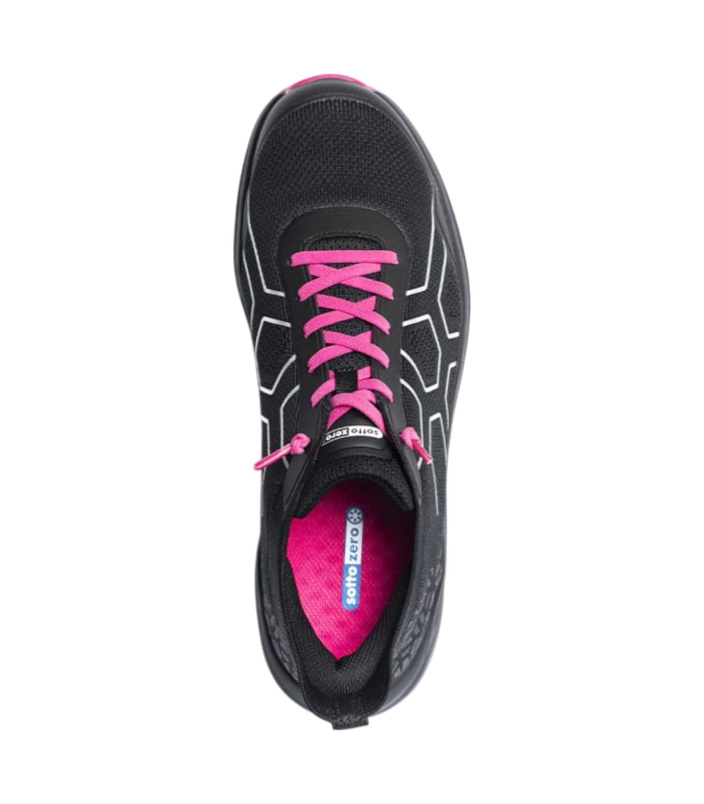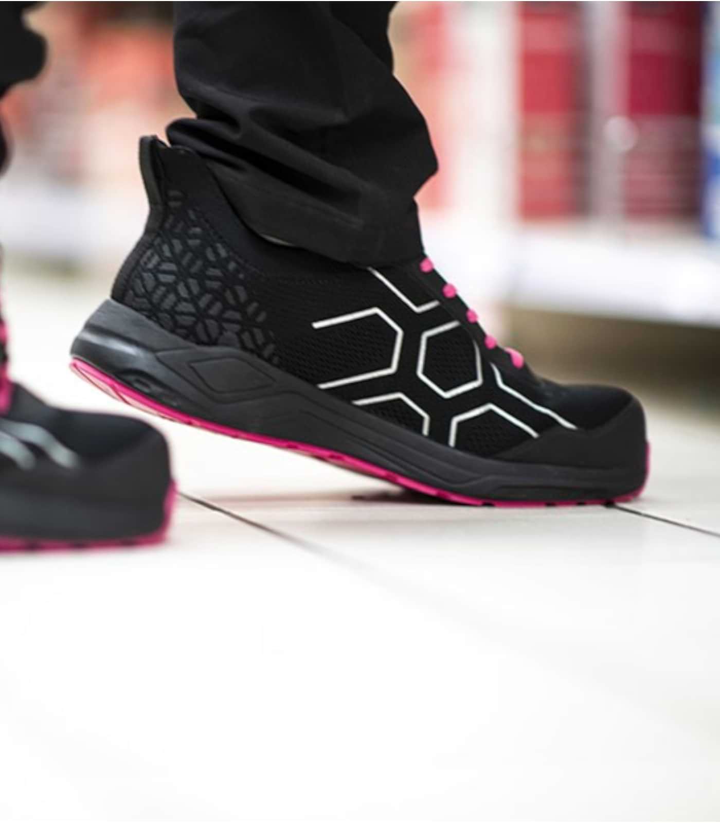 Scarpa antinfortunistica donna S1PS ultraleggera (400g) nera e fucsia con puntale in fibra di carbonio. Design slip-on per calzata senza mani, massima traspirabilità, protezione ESD e suola resistente al calore. Comfort e sicurezza per il piede femminile.