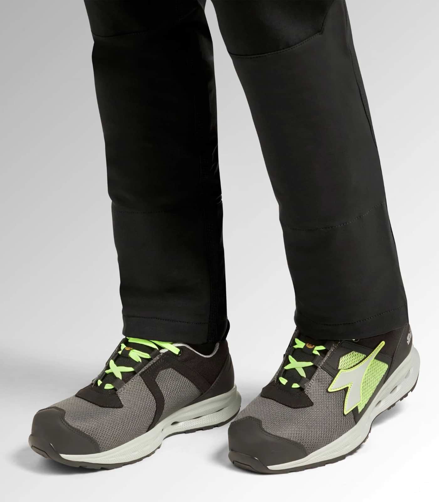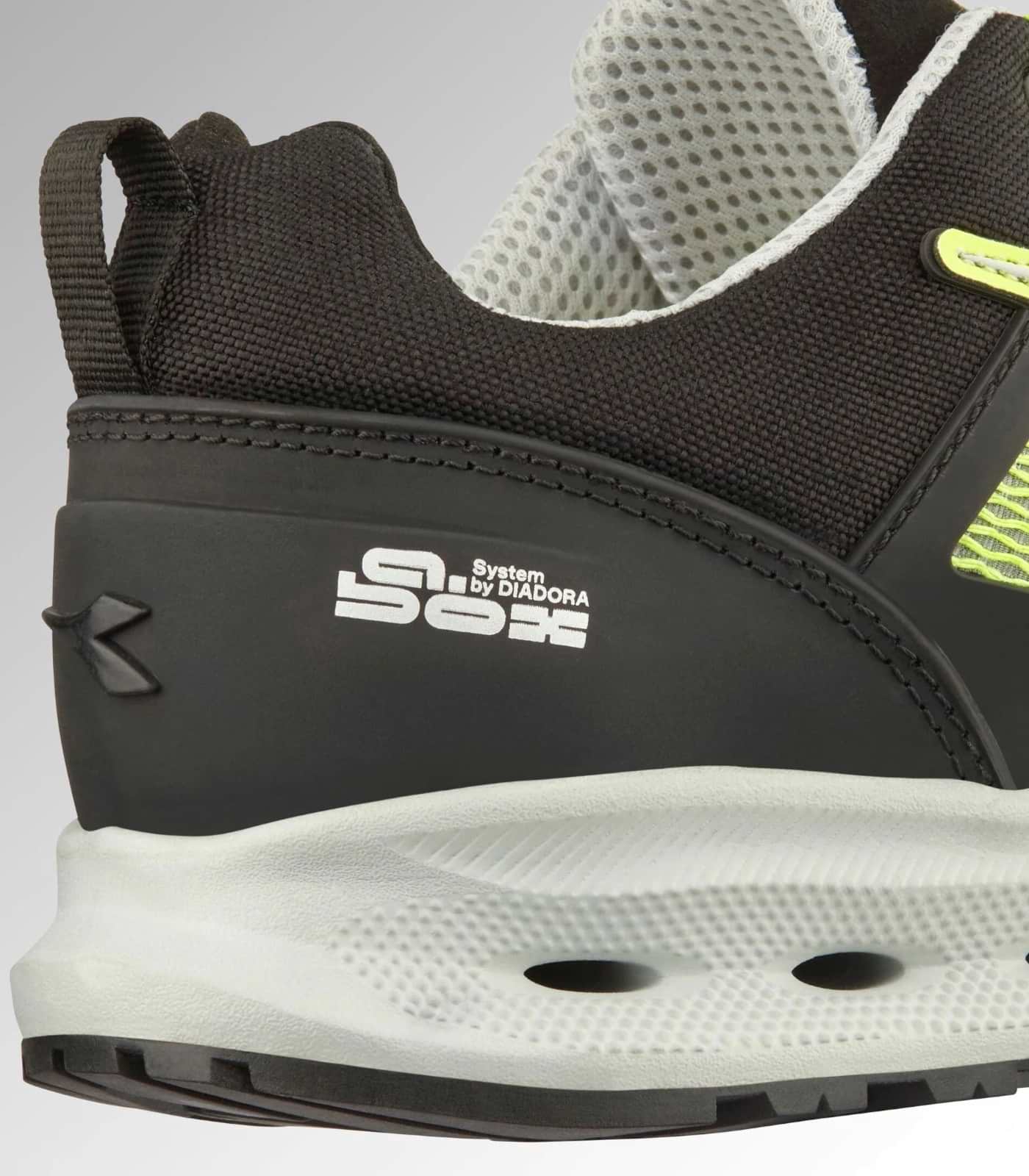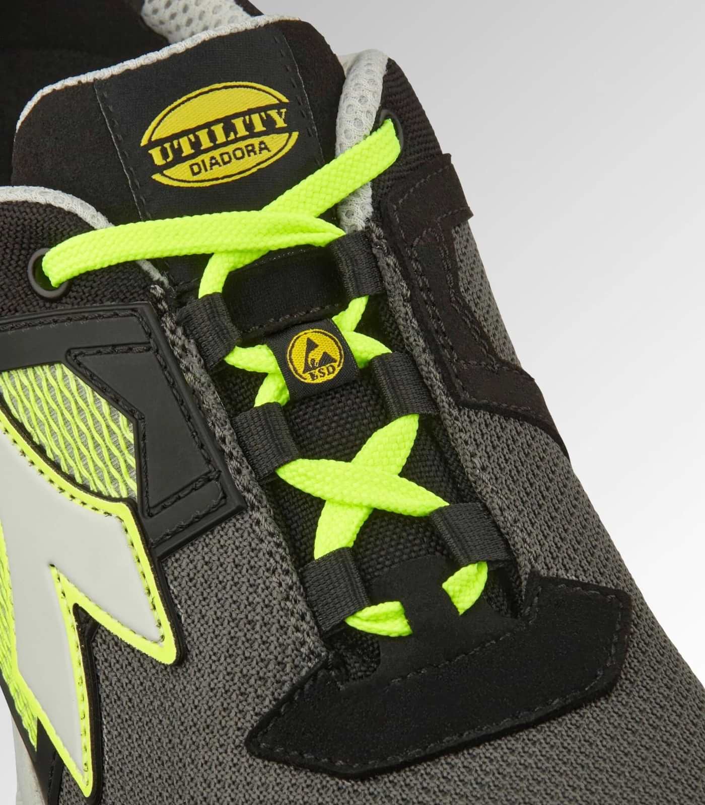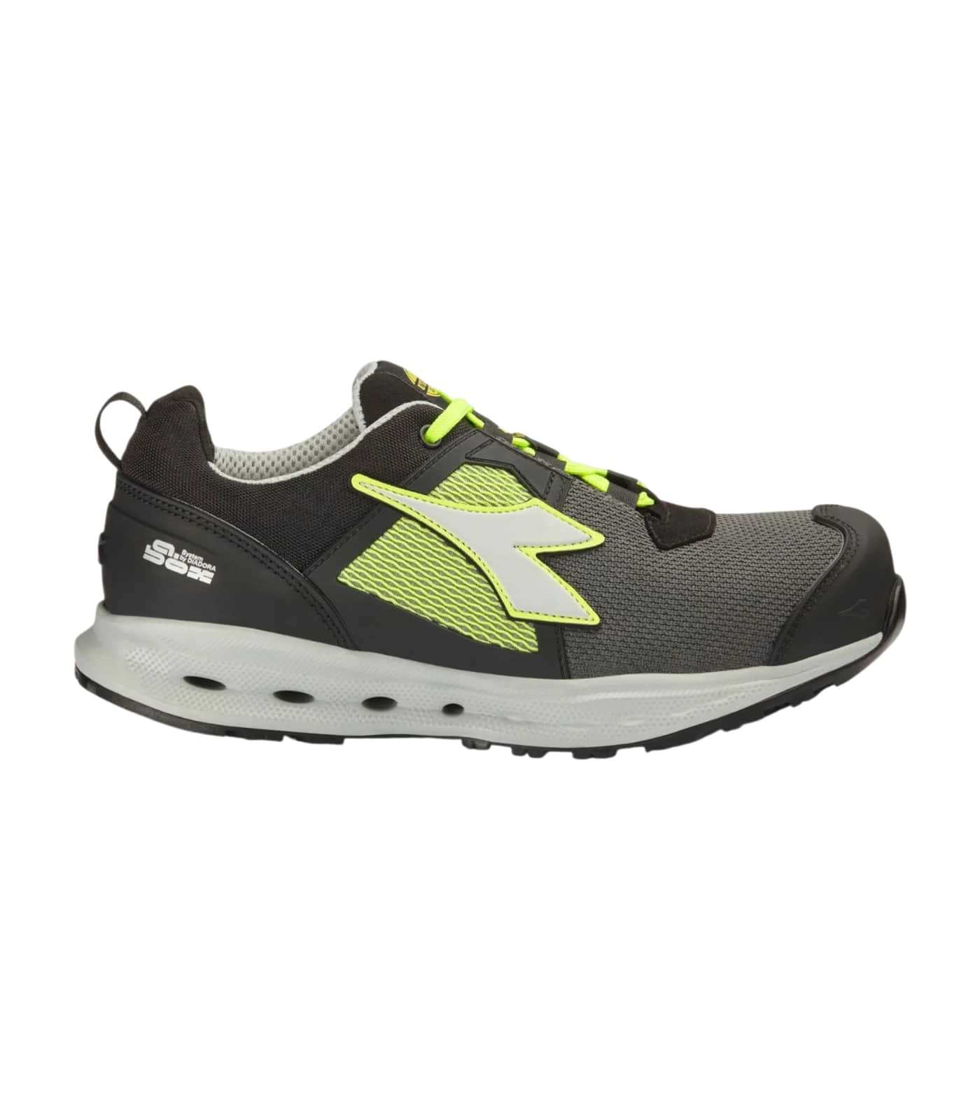Scarpa antinfortunistica Diadora Glove A.Box Ghost S1PS nera e gialla fluo. Tessuto Cordura traspirante, tecnologia A.Box per la ventilazione laterale e protezione ESD. Leggera, flessibile e sicura.