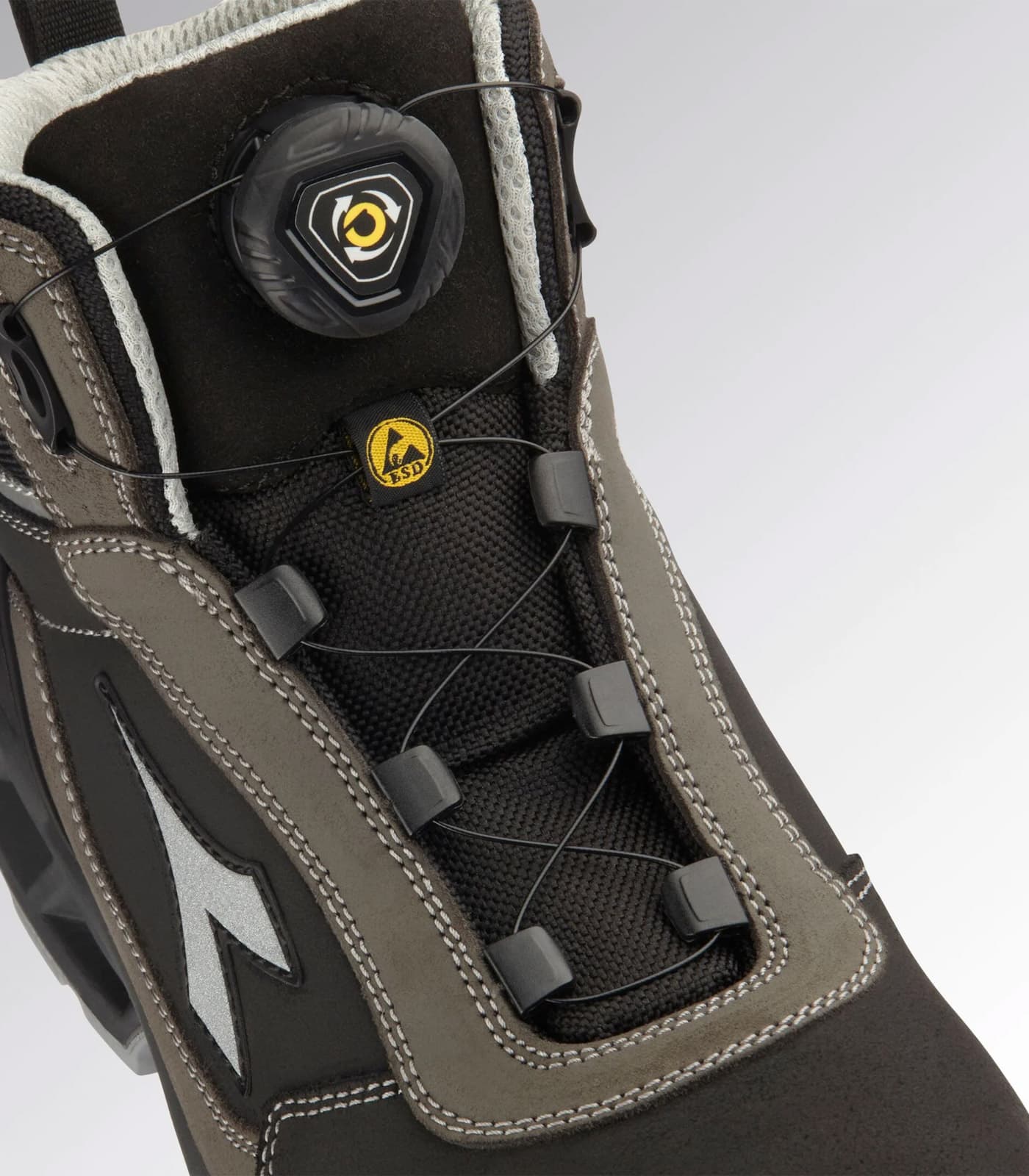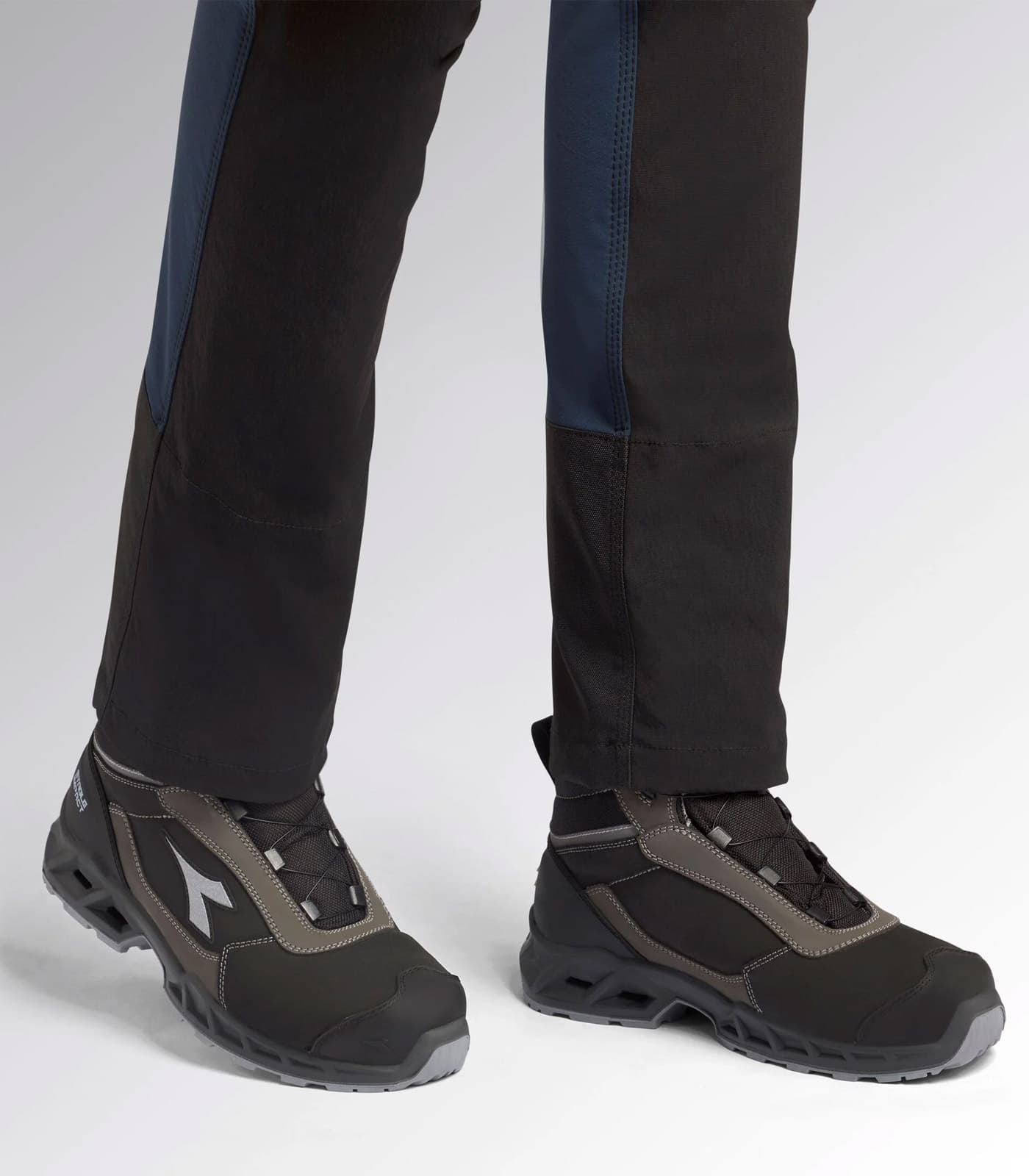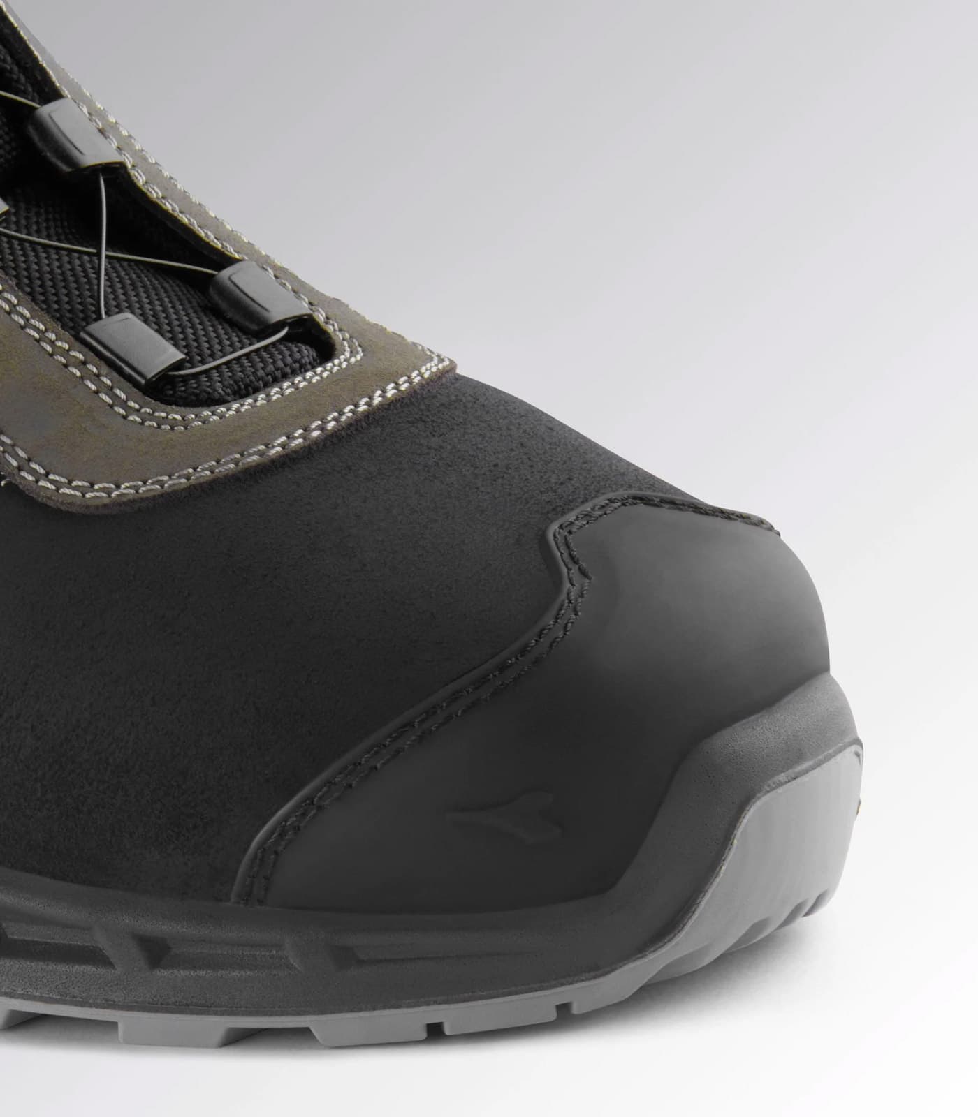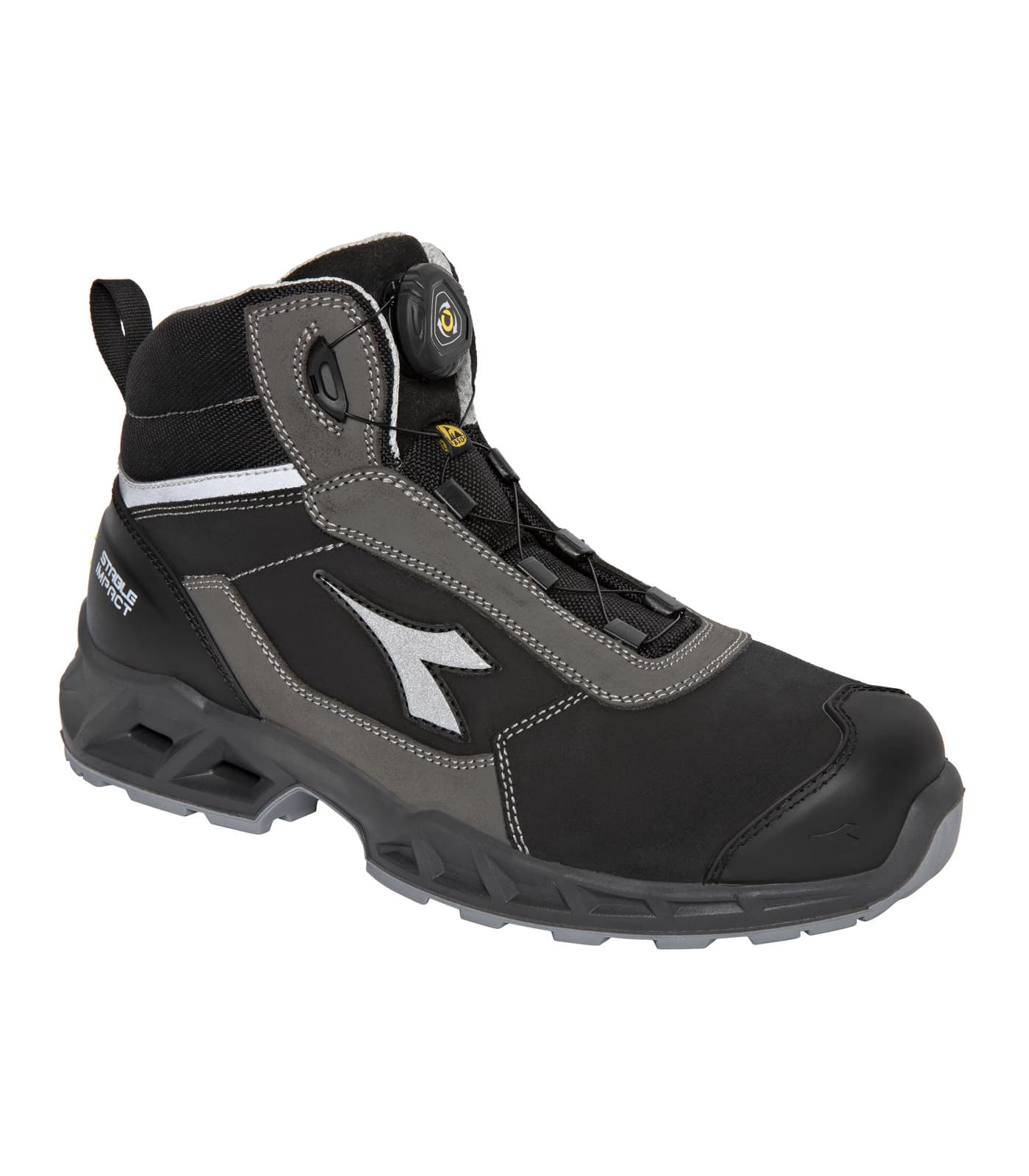 Calzatura di sicurezza mid-cut S3S idrorepellente in pelle bovina scamosciata. Supporto ergonomico del tallone e protezione della punta in TPU. Sistema di allacciatura rapida Quick Release System by Diadora. Puntale in alluminio 200J. Inserto antiperforazione K-SOLE. Calzata 11. Tecnologia di ammortizzazione Stable Impact System. Fodera in Air Mesh con antiscalzante in microfibra. Plantare anatomico microforato, antistatico estraibile in PU espanso riciclato a celle aperte, traspirante con carboni attivi. ESD.