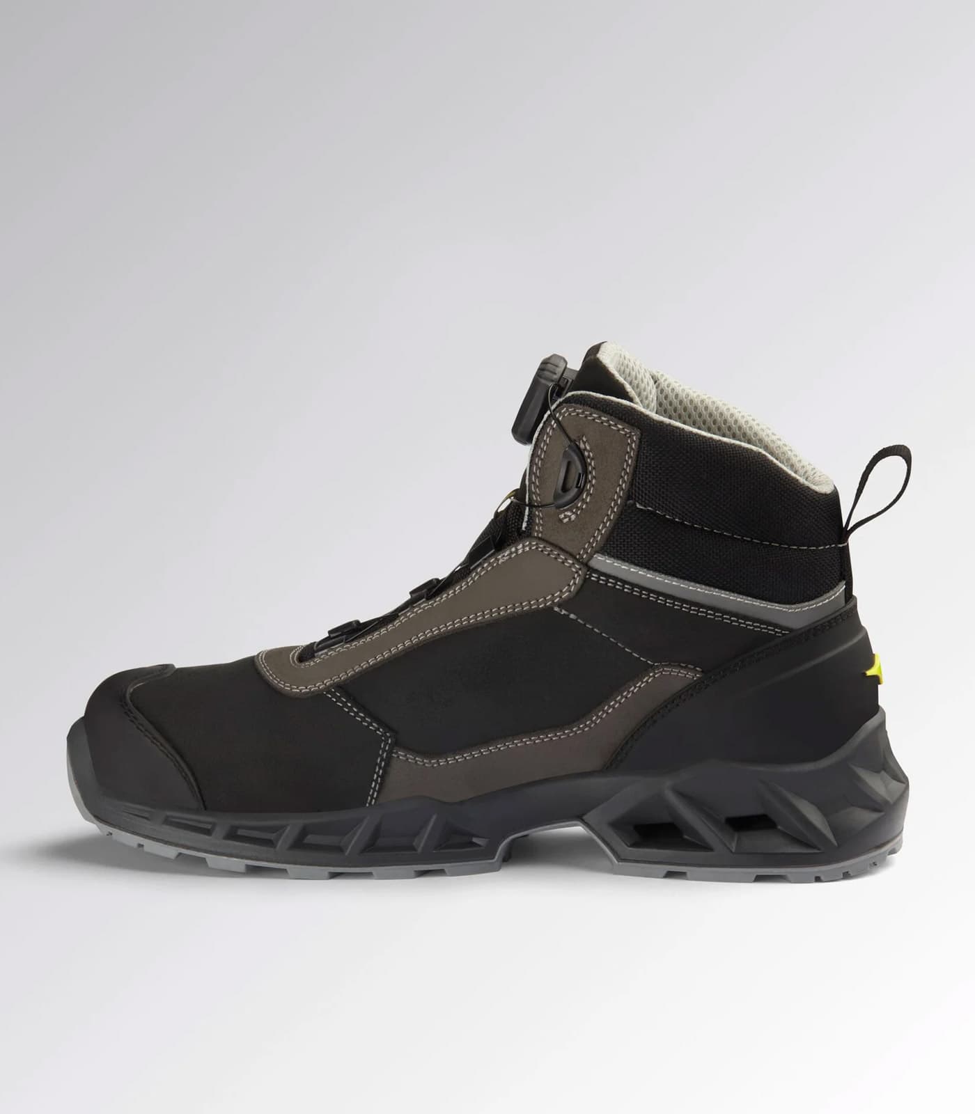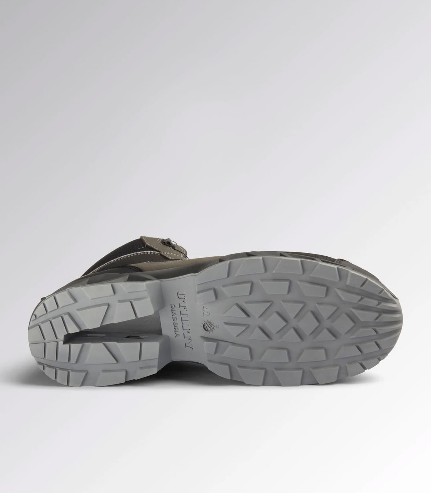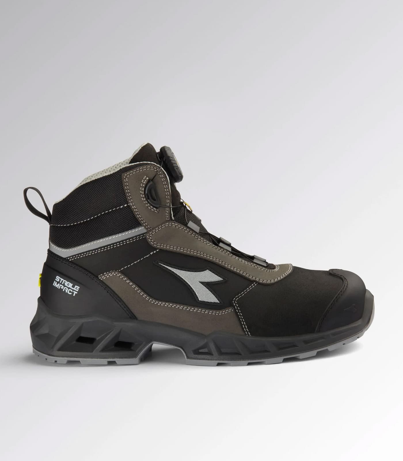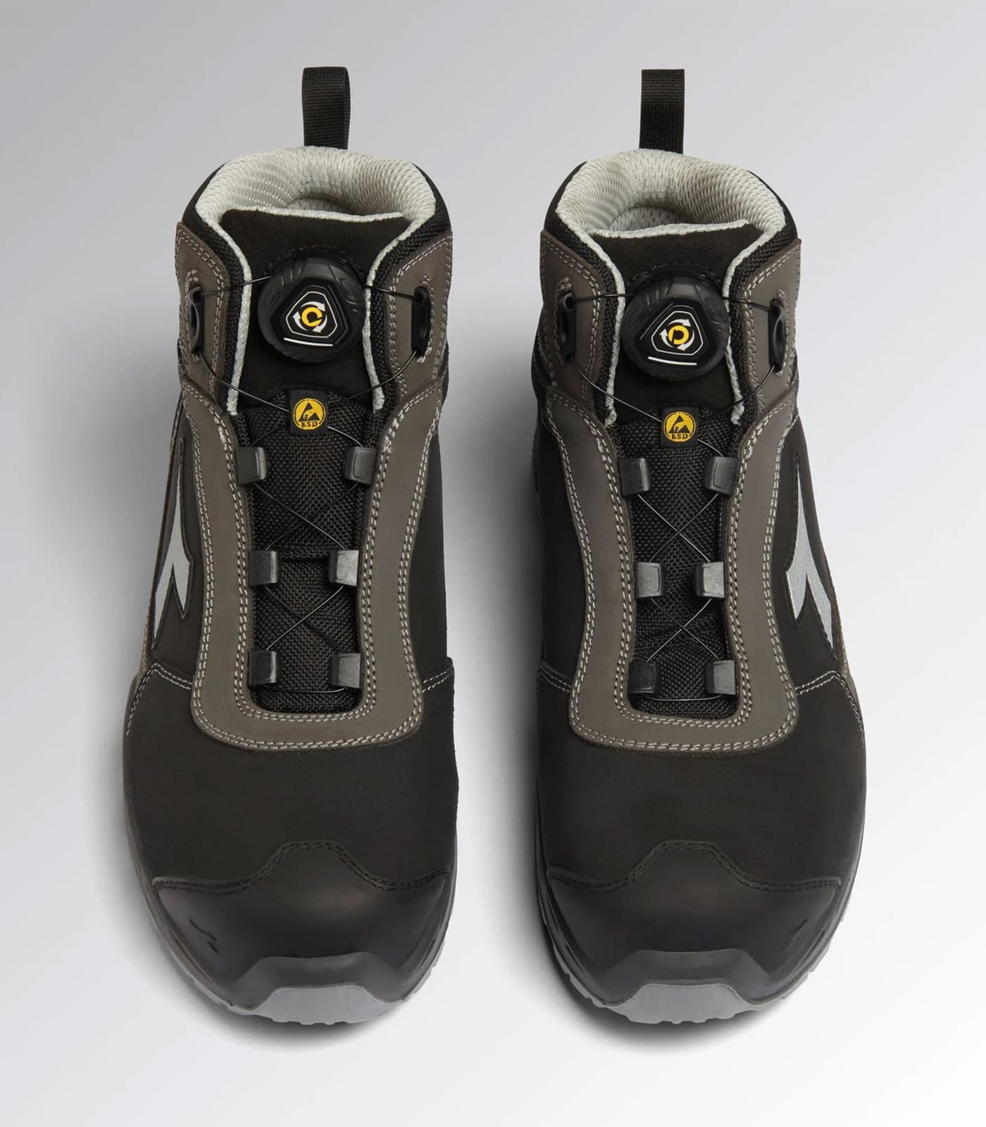 Calzatura di sicurezza mid-cut S3S idrorepellente in pelle bovina scamosciata. Supporto ergonomico del tallone e protezione della punta in TPU. Sistema di allacciatura rapida Quick Release System by Diadora. Puntale in alluminio 200J. Inserto antiperforazione K-SOLE. Calzata 11. Tecnologia di ammortizzazione Stable Impact System. Fodera in Air Mesh con antiscalzante in microfibra. Plantare anatomico microforato, antistatico estraibile in PU espanso riciclato a celle aperte, traspirante con carboni attivi. ESD.