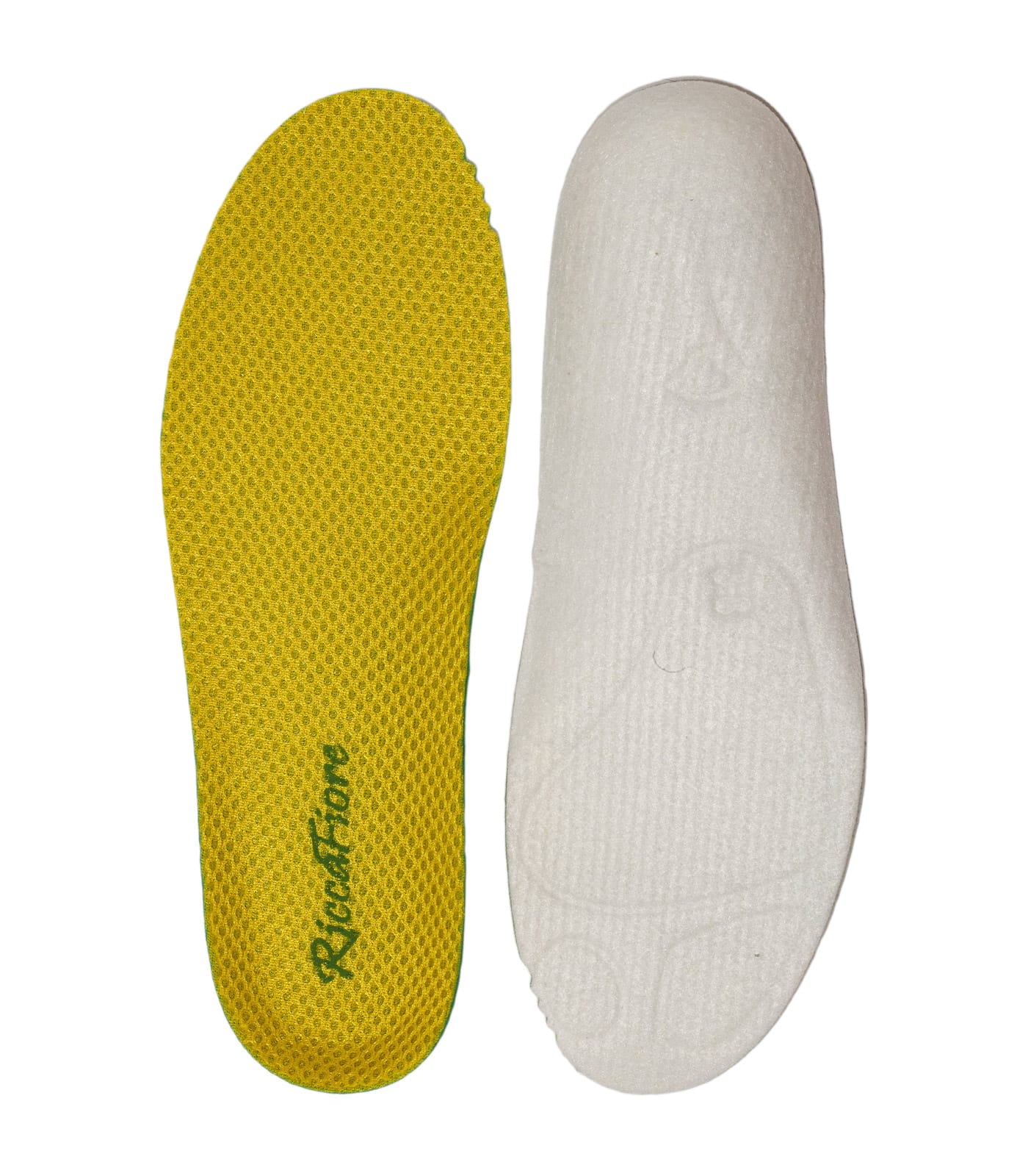 Sottopiede preformato con base in feltro, strato in memory e tessuto tecnico traspirante in rete 3D. Ergonomico, confortevole, soffice, antibatterico, traspirante, termico, materiale reciclato, leggero.
