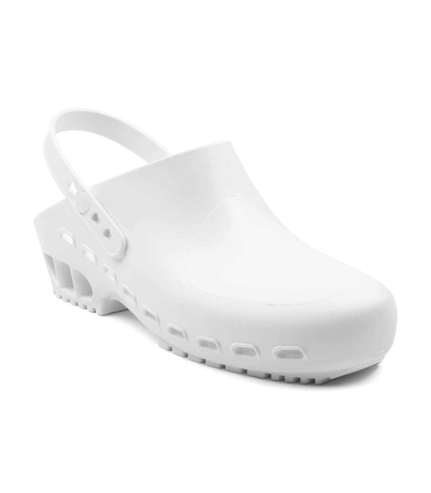 Zoccolo autoclavabile Isacco bianco professionale (Senza Puntale). Sterilizzabile a 135°C, antiscivolo e antistatico. Realizzato in materiale termoplastico omologato EN 347-1, ideale per medici, infermieri e settore alimentare.